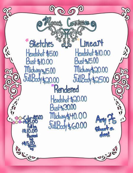 Prices are subject to change.Commissioned pieces automaticallywill be used in my portfolio and as examples for commissions. Adding additional characters will be an extra $2.00 USD.Prices are negotiable if determined reasonable. NSFW art is allowed, but you must be +18 in order to purchase and show proof of age with an ID.No ID, no nsfw art, it is what it is. TAT can be from 1week-3monthsdepending on the complexity of a piece. Updates are always shown while the art work progresses, allowing you to make changes to the piece. My methods of payment are paypal, venmo, and cashapp. Tips are accepted! By reading this, you acknowledge and agree to these terms.